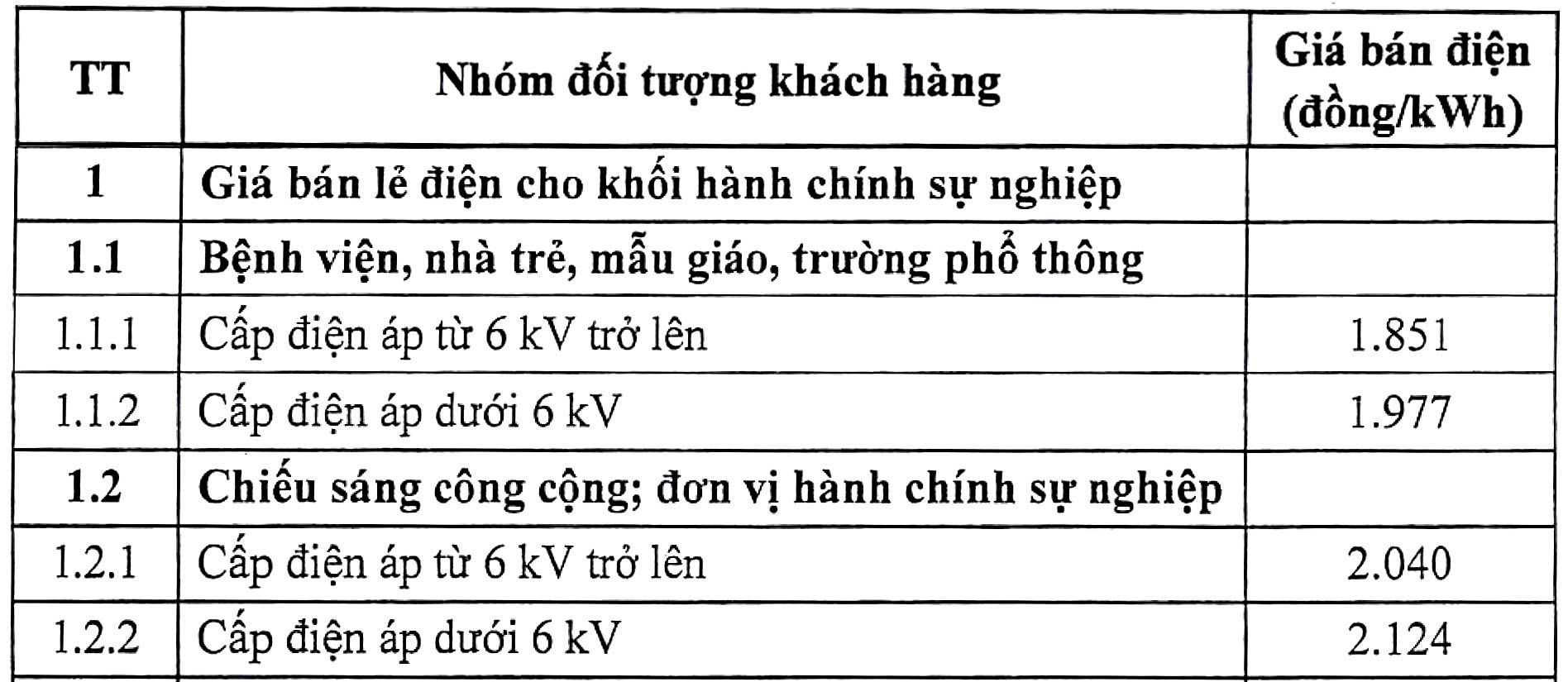 GIÁ BÁN LẺ ĐIỆN CHO KHỐI HÀNH CHÍNH SỰ NGHIỆP