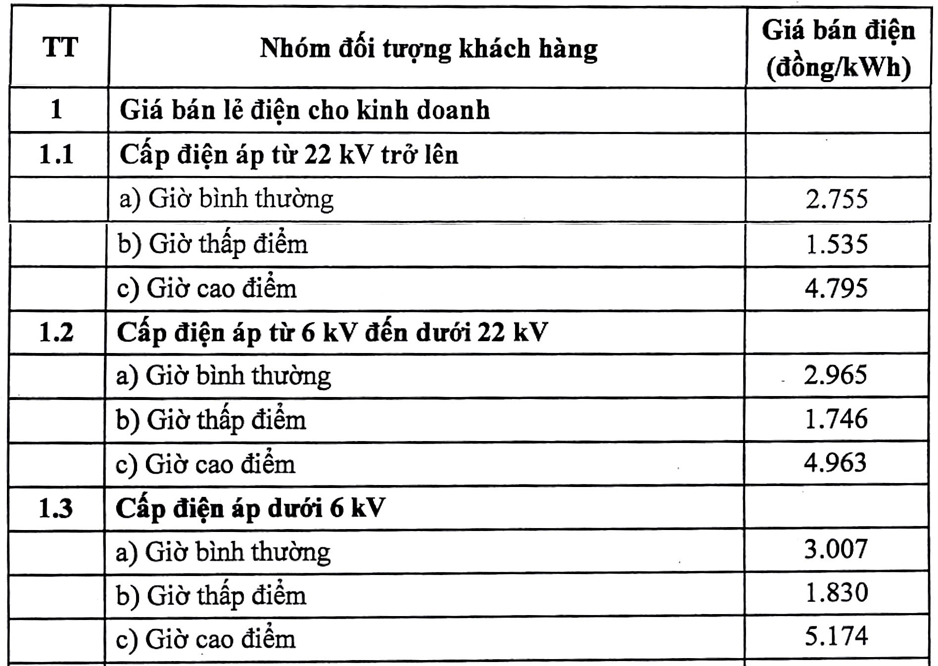 GIÁ BÁN LẺ ĐIỆN CHO KINH DOANH