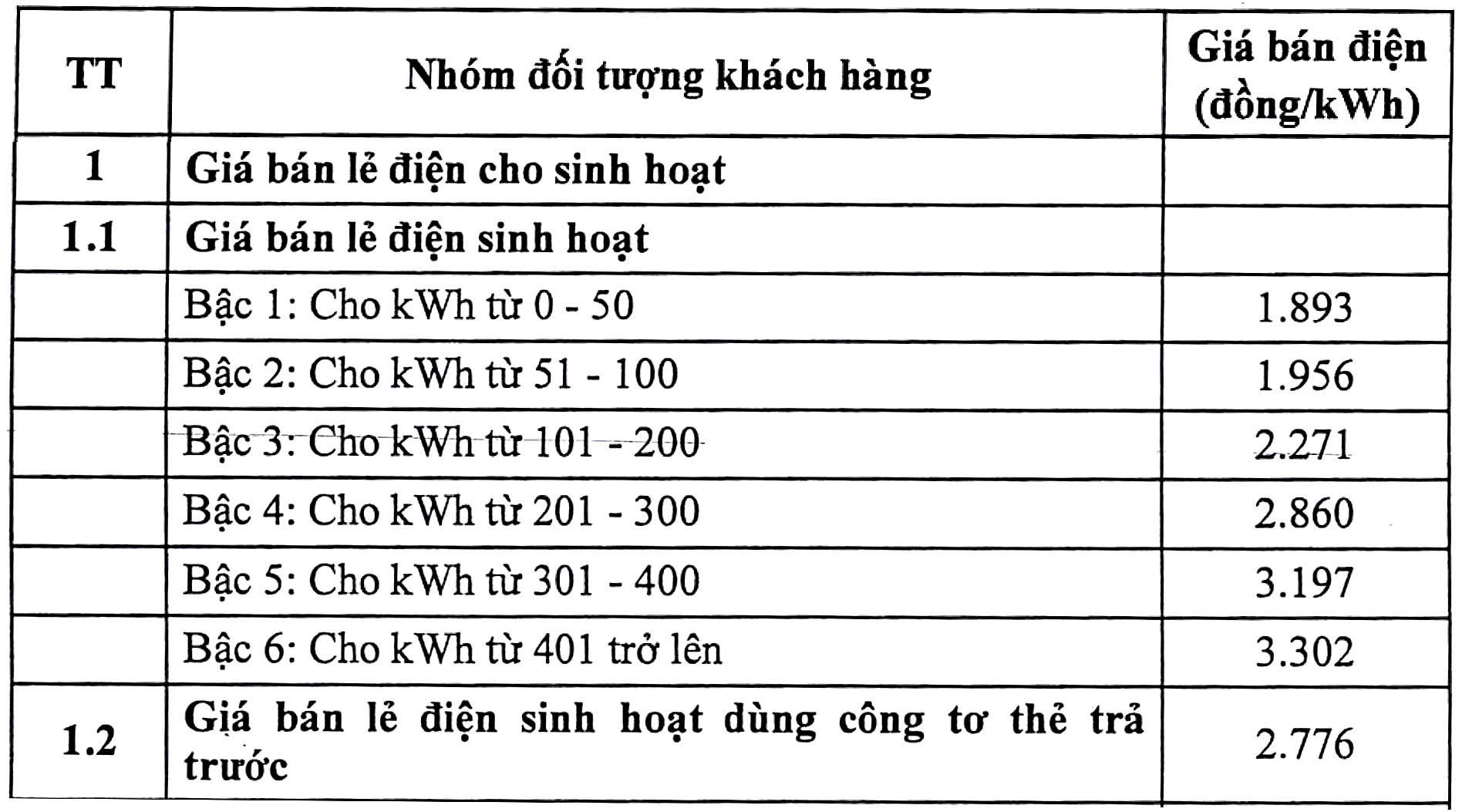 GIÁ BÁN LẺ ĐIỆN CHO SINH HOẠT