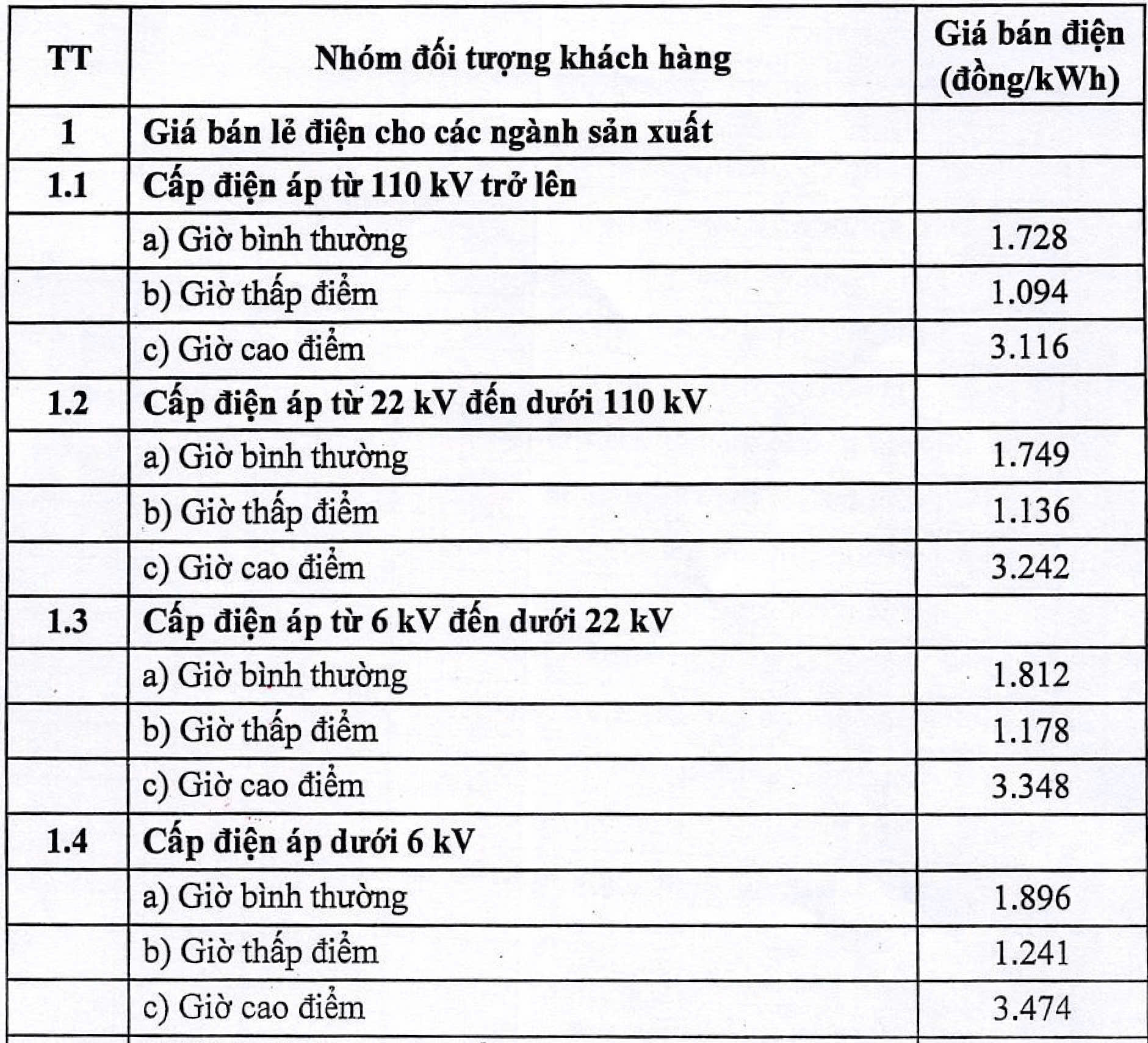 GIÁ BÁN LẺ ĐIỆN CHO CÁC NGÀNH SẢN XUẤT